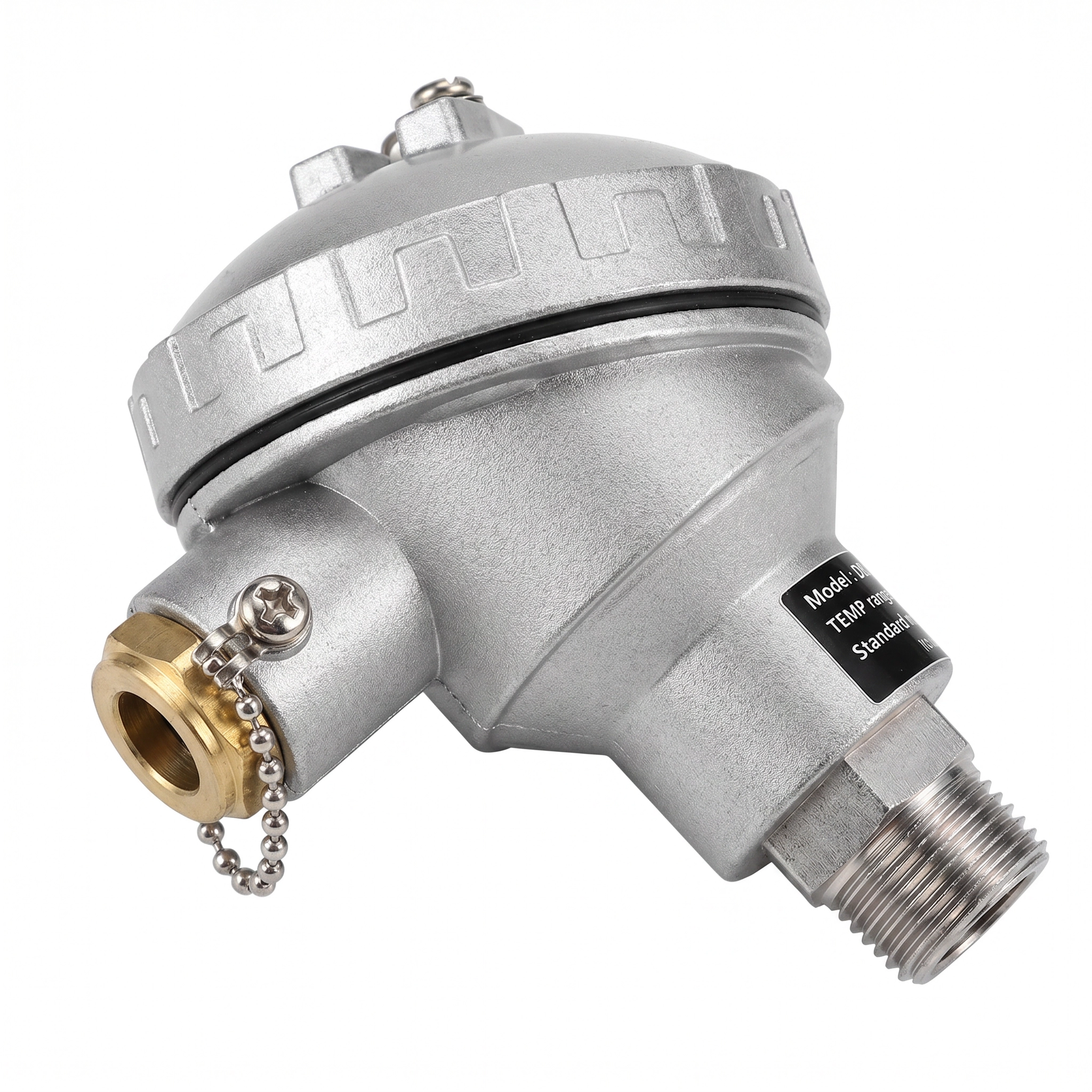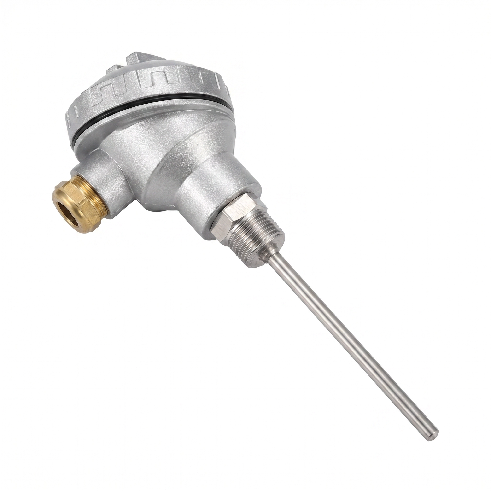 Termopar industrial Tipo J (Ferro-Constantan) com cabeçote em alumínio fundido modelo KFY-001 e rosca de processo 1/2" NPT. Haste em aço inoxidável 304 com diâmetro de 6mm e 100mm de comprimento, junção aterrada para resposta rápida. Ideal para caldeiras, fornos, reatores, tubulações de vapor, tanques de processo e ambientes industriais severos com faixa de medição até 600°C.