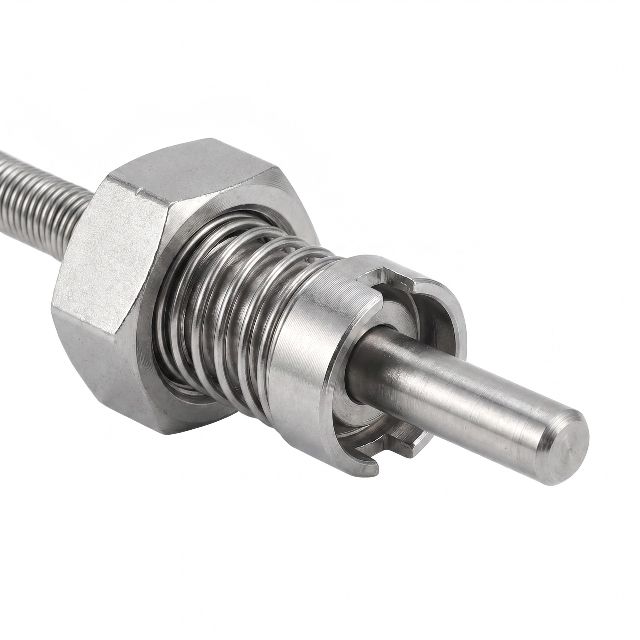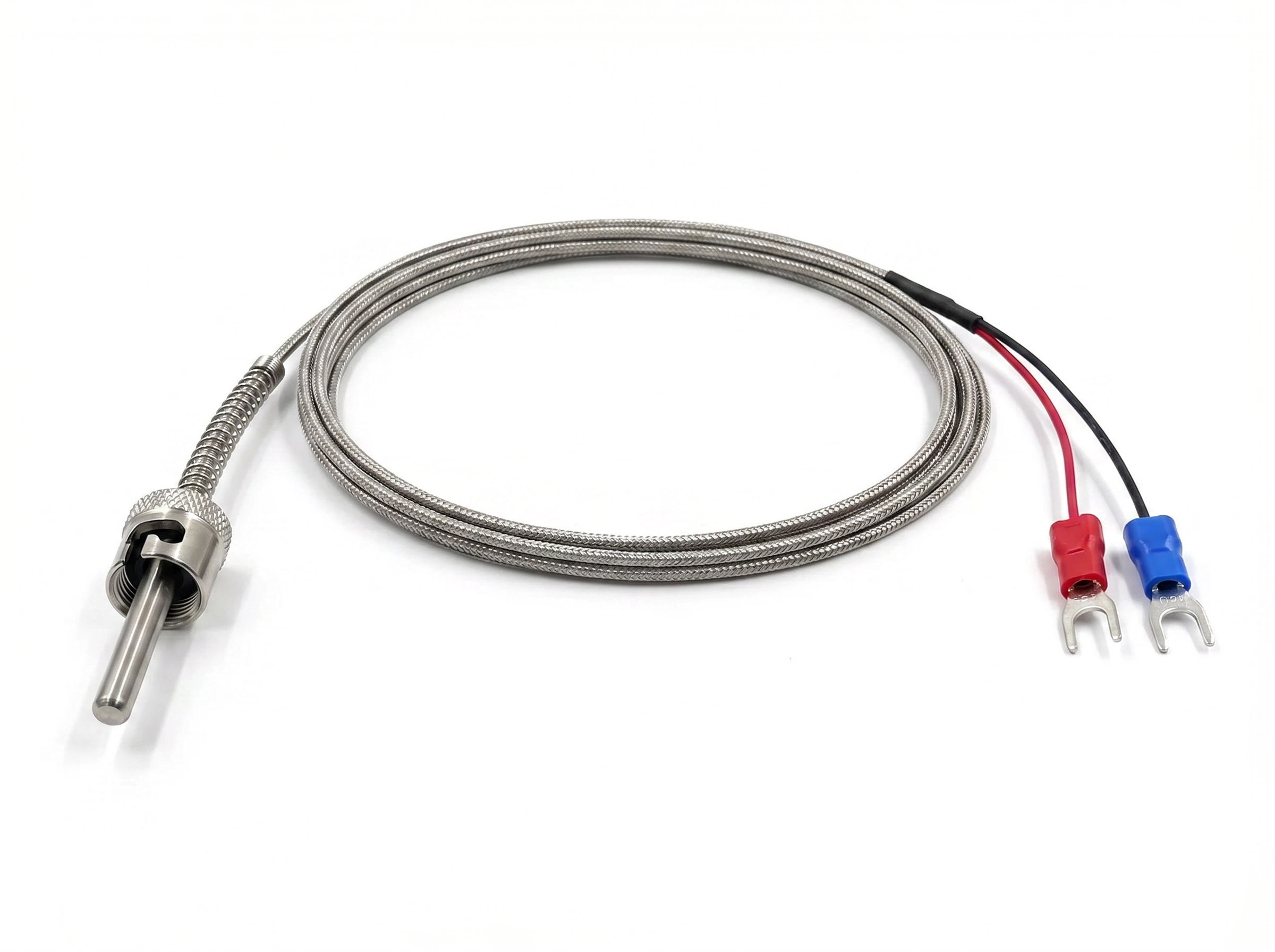 Termopar industrial Tipo K com adaptador baioneta M12 e mola de compressão ajustável. Equipado com cabo blindado de 2 metros em malha de aço inoxidável trançado e junção aterrada para resposta rápida. Ideal para injetoras de plástico, extrusoras, fornos industriais, prensas térmicas e sistemas de aquecimento que exigem medição precisa e confiável de temperatura até 800°C.