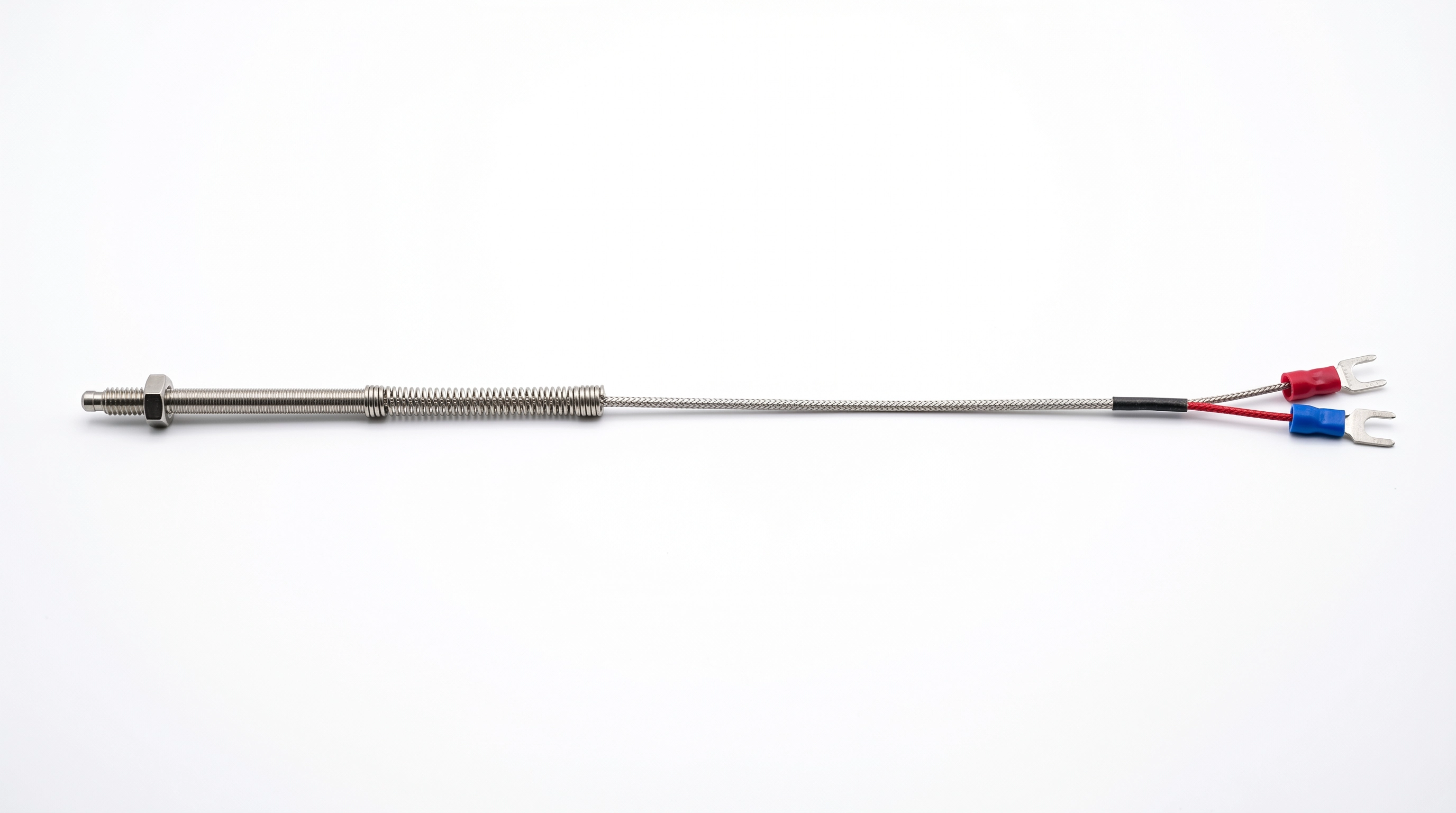Termopar Tipo K com rosca fixa M6 para instalação direta em furos roscados. Design compacto tipo bico (screw-in nozzle) ideal para máquinas, tubulações e equipamentos industriais. Haste curta em aço inoxidável 304 com junção aterrada para resposta rápida. Cabo de 2 metros em malha trançada de aço inoxidável com terminais forquilha.